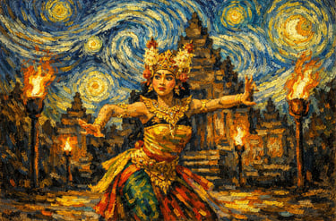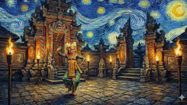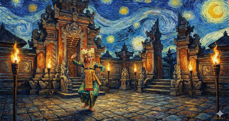 "Seorang penari Bali sedang menari di halaman candi kuno, gaya lukisan minyak (Oil Painting) ala Van Gogh dengan goresan kuas tebal, latar belakang langit berbintang berputar, pencahayaan dramatis dari obor api, sudut pandang sejajar mata (eye-level), material kanvas kasar, suasana sakral dan artistik."