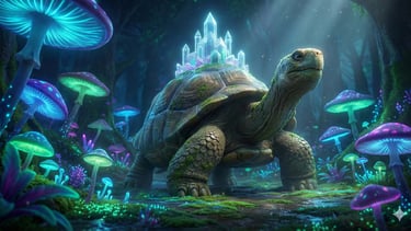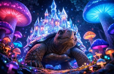"Seekor kura-kura raksasa yang cangkangnya adalah kastil kristal bening, berjalan di tengah hutan jamur yang menyala, gaya animasi 3D Pixar, pencahayaan neon (bioluminescent), sudut pandang mata cacing (worm's eye view), material kulit tekstur realistis, suasana magis dan misterius."