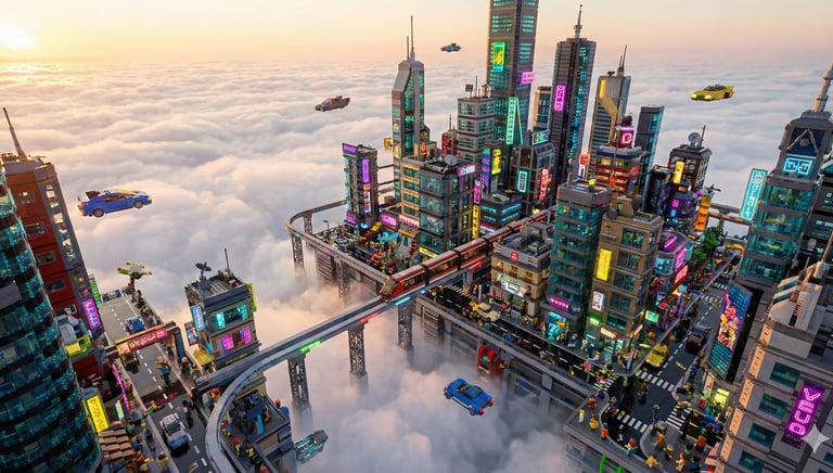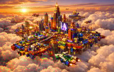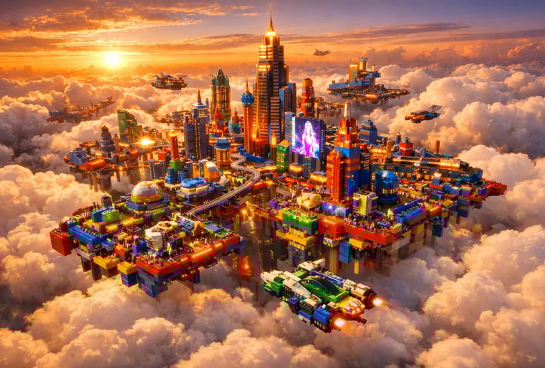 "Sebuah kota metropolitan futuristik yang seluruhnya terbuat dari balok LEGO warna-warni, melayang di atas awan putih tebal, gaya Cyberpunk, pencahayaan matahari terbenam (golden hour), sudut pandang mata burung (bird's eye view), material plastik mengkilap, suasana sibuk dan canggih."