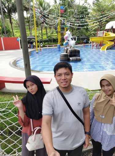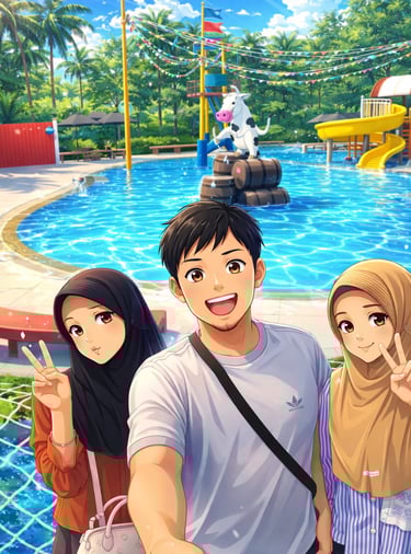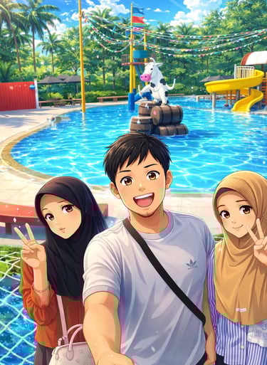 "A vibrant modern Japanese anime illustration of a young man (big brother) and his two little sisters taking a group selfie at a sunny water park. Center: young Asian man in a grey t-shirt smiling widely. Sides: two cute girls wearing hijabs (black and light brown) doing peace signs. Background: sparkling blue swimming pool, yellow spiral water slide, and a funny cow statue standing on barrels. Style: high-quality anime art, sharp clean outlines, vivid saturated colors, cel-shading shadows, energetic atmosphere, shimmering water effects, clear blue sky, digital animation look."